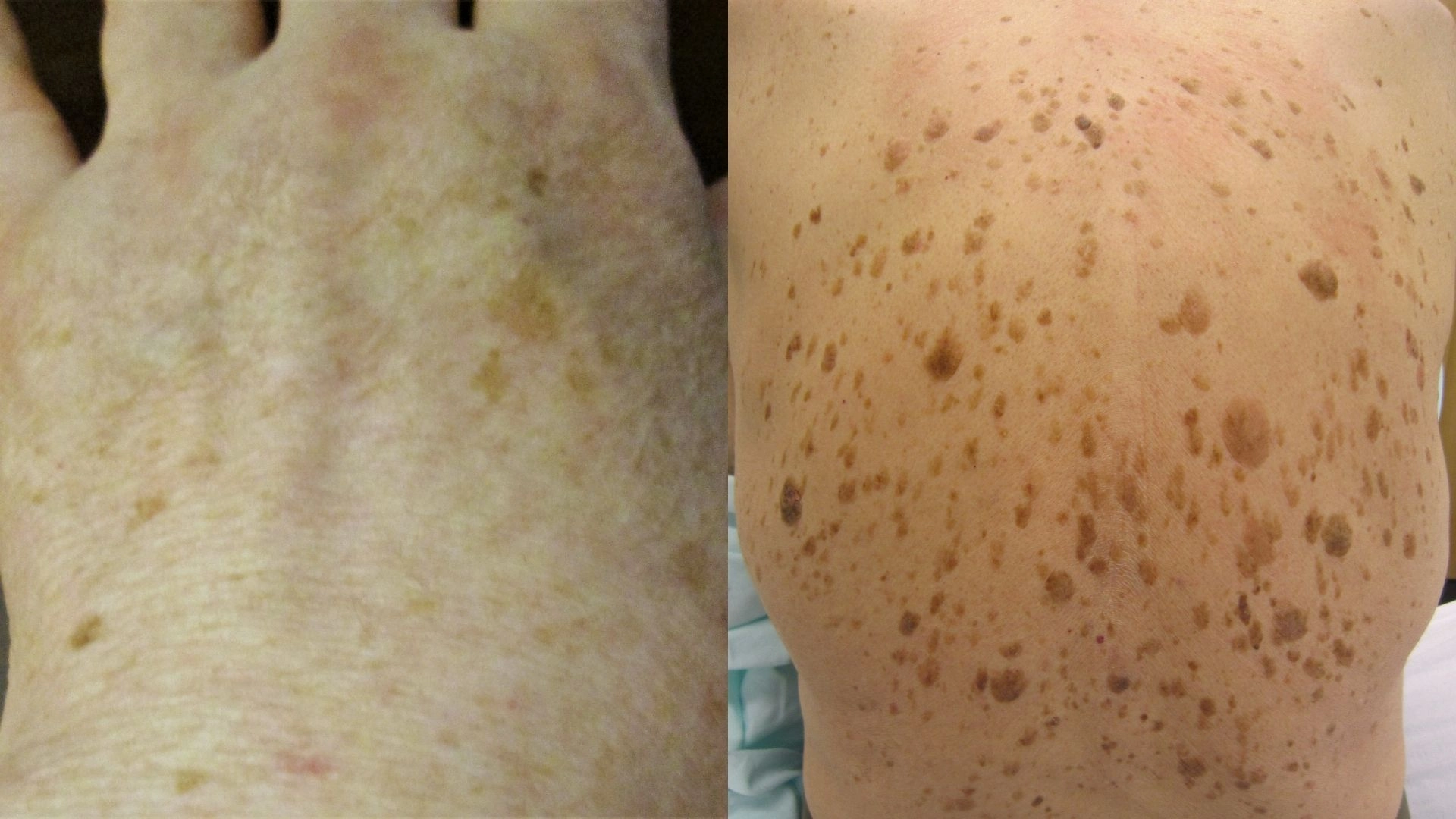 左:日光性黑子 / 來源:由 Beyond My Ken - 自己的作品, CC BY-SA 4.0, https://commons.wikimedia.org/w/index.php?curid=70134653 右:脂漏性角化 / 來源:By James Heilman, MD - Own work, CC BY-SA 3.0, https://commons.wikimedia.org/w/index.php?curid=14772874 老人斑和其他色斑怎麼分? 肝斑 :